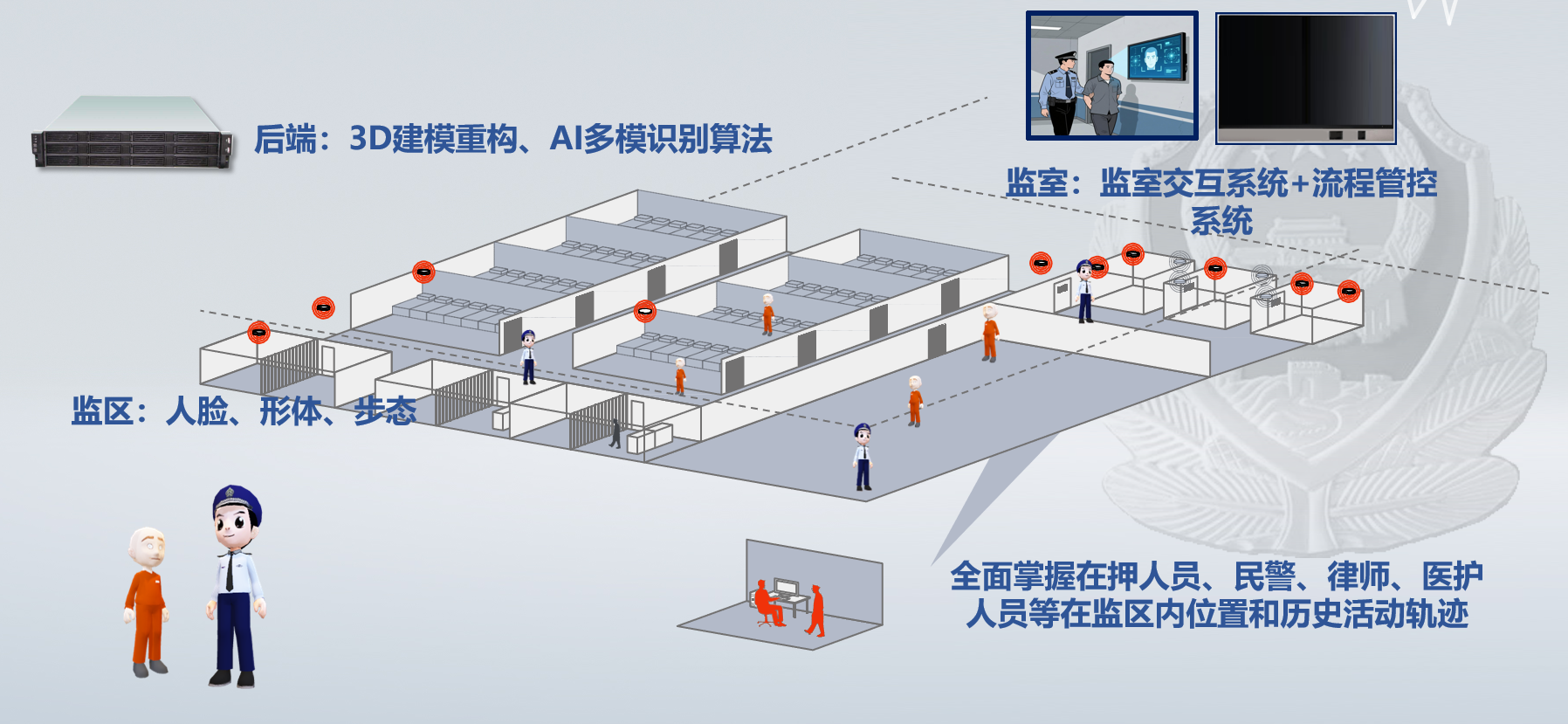 提供自助办案终端、人证核验、定位基站、一体化审讯桌、电子脚镣,医疗随诊包、情绪分析、测谎仪、语音转写等多类软硬结合的产品,助力公安执法办案、监所管理。