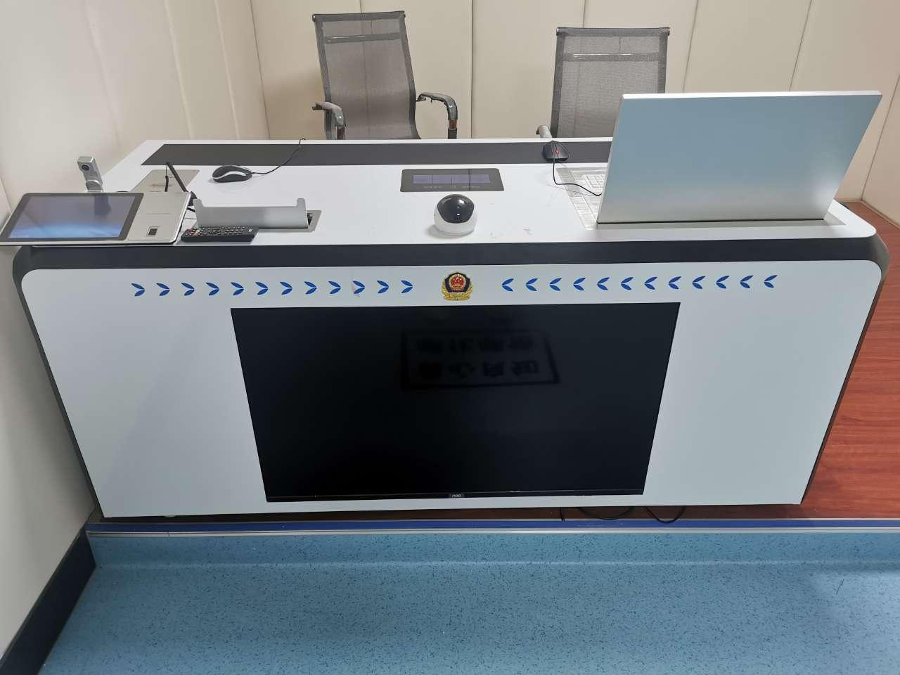 智能一体化审讯桌,集成审讯台、审讯主机、特写像机、拾音器、音箱、插排、交换机、报警按钮、智能中控屏、升降屏、打印机等为一体,并预留设备放置位置,集成度高,科技感强,无尖锐棱角、简洁安全。
